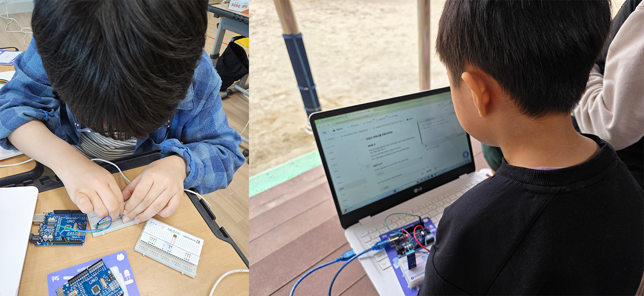 학생들은 우리 학교 주변이나 동네의 날씨를 관측하고, 데이터를 시각화해보며 환경과 과학, 그리고 디지털 기술이 연결되는 경험을 하게 됩니다. 현장에서는 “내가 만든 코드로 실제 날씨가 보이는 게 신기했다”, “친구들과 함께 데이터를 비교해보는 게 재미있었다”는 반응이 많았습니다. 이 수업은 아이들에게 디지털 역량을 실제 문제에 적용해보며 기르는 의미 있는 학습 경험을 경험을 제공합니다.