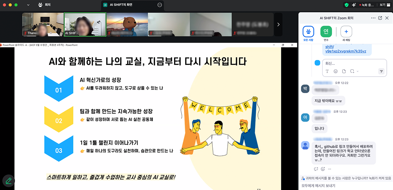 특히 그룹별 실습과 질의응답 과정에서 교사들은 서로의 활용 사례를 보며 “이건 바로 다음 주 수업에 써먹을 수 있겠다”는 감각을 얻습니다. 온라인이지만, 현장과 분리되지 않았다는 점이 AIOF의 가장 큰 차별점입니다. |