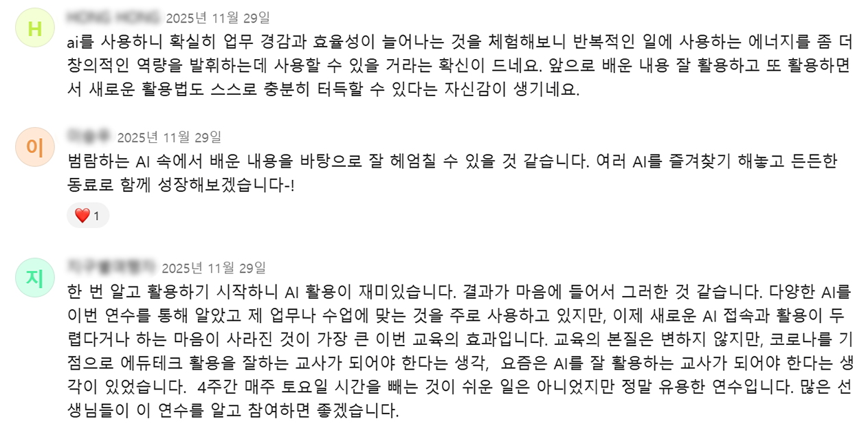 이런 반응은 AIOF가 ‘AI를 알려주는 교육’이 아니라 교사의 일상을 바꾸는 학습 경험으로 설계되었음을 보여줍니다. |